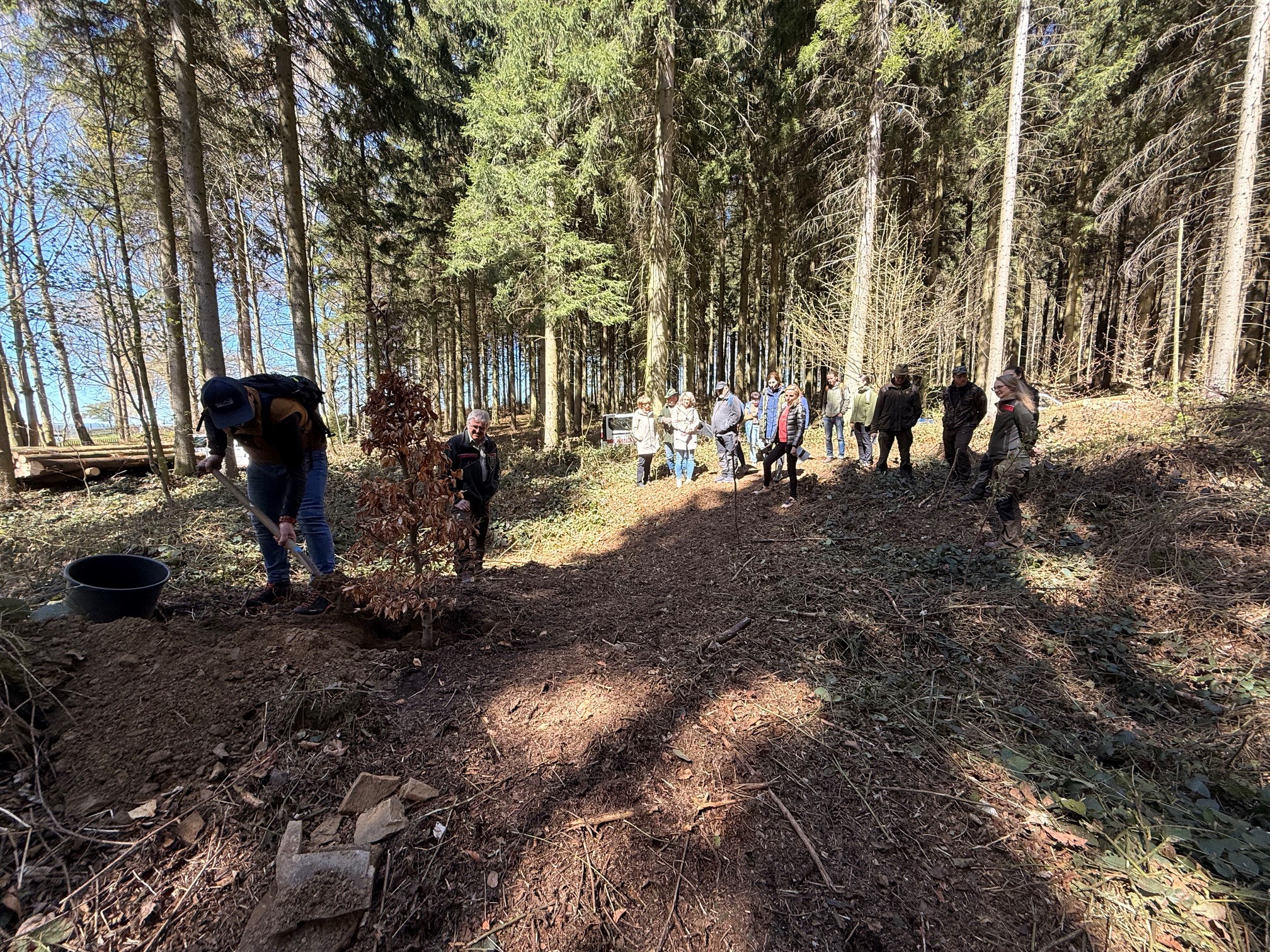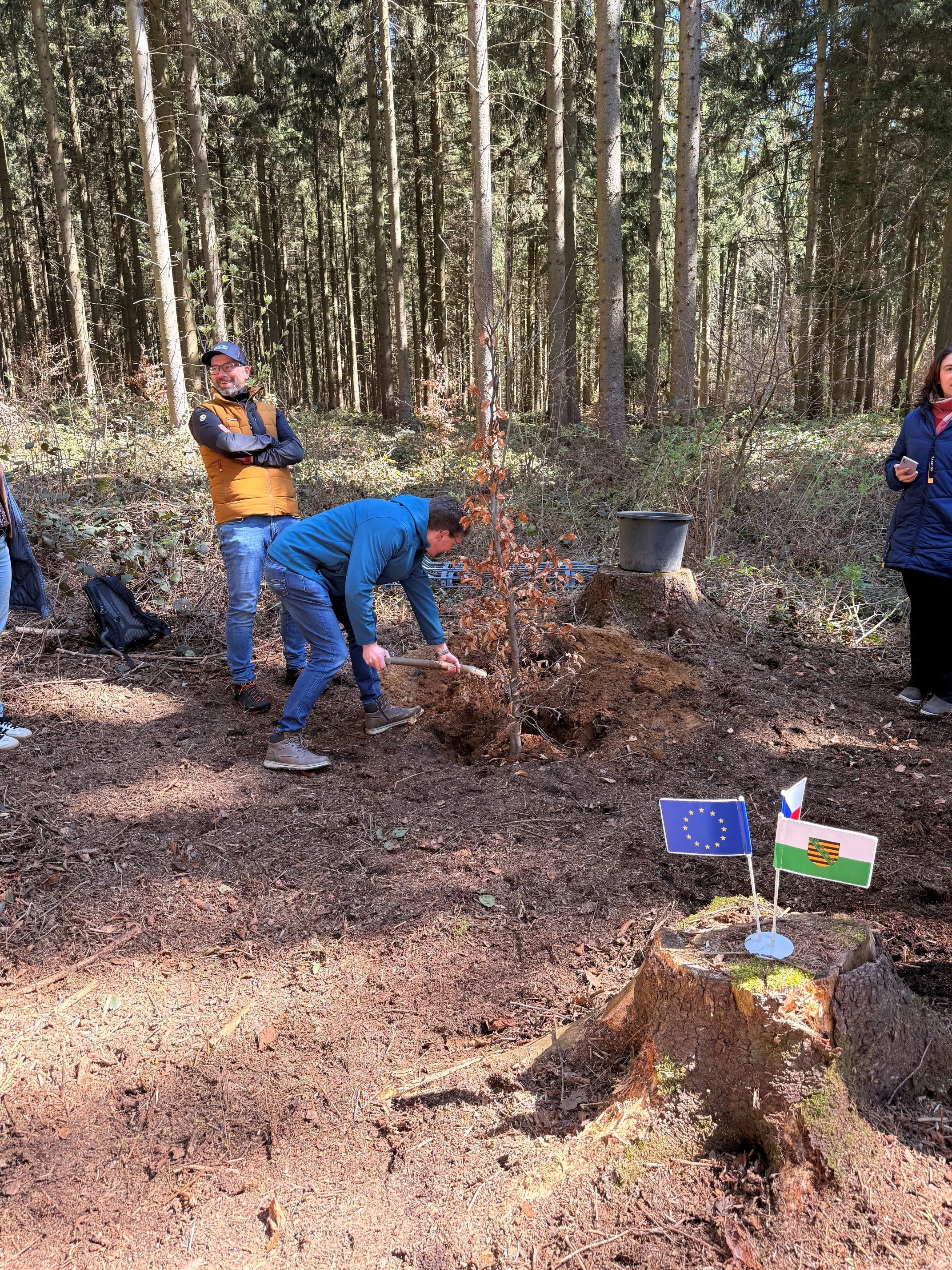 Ergänzend wurden symbolisch zwei Buchen gepflanzt, die die Partnerschaft der Projektbeteiligten sowie deren gemeinsame Verantwortung und Verbundenheit im Waldumbau unterstreichen.