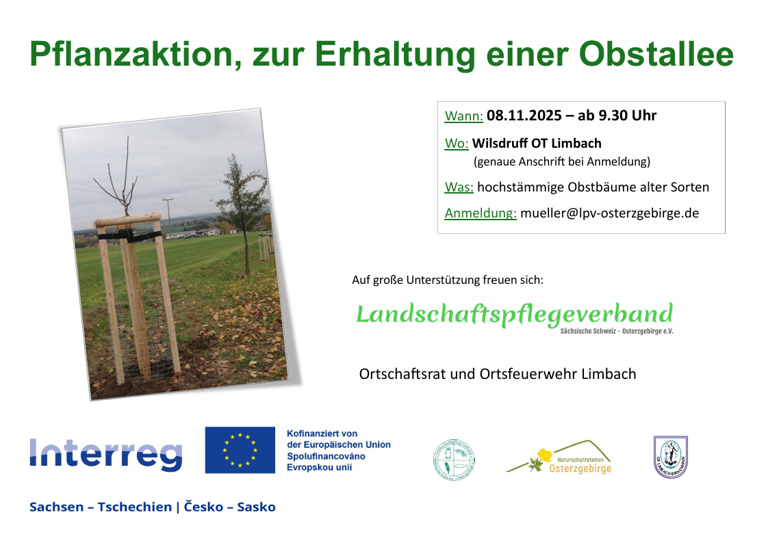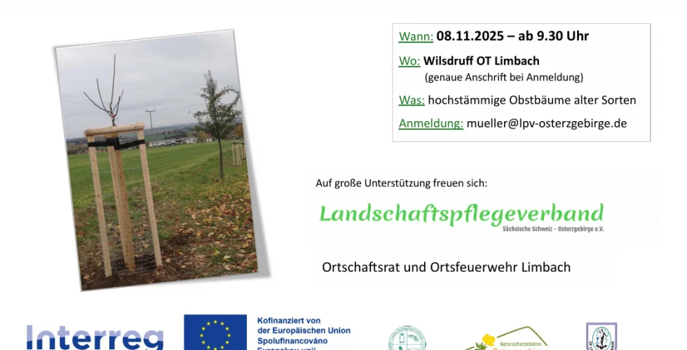 Co: vysoké ovocné stromy starých odrůd Registrace: mueller@lpv-osterzgebirge.de Těšíme se na velkou podporu: Landschaftspflegeverband Sächsische Schweiz-Osterzgebirge, Místní rada a místní hasiči Limbach