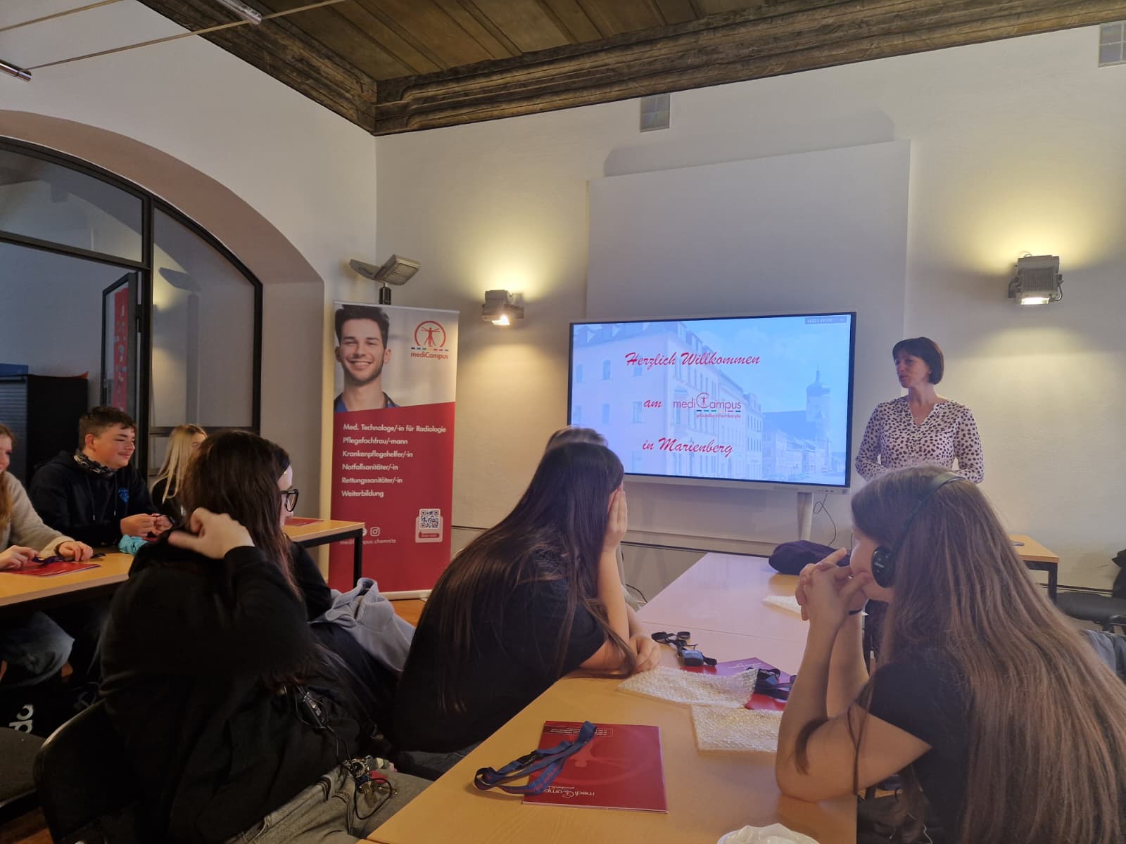 Odpoledne následovaly dvě zajímavé exkurze do podniků: v mediCampus Marienberg se mladí lidé dozvěděli mnoho o povoláních v oblasti péče a zdravotnictví, zatímco v Erzi Qualitätsprodukte aus Holz GmbH jim byl názorně vysvětlen proces od prvního nápadu až po hotový produkt.