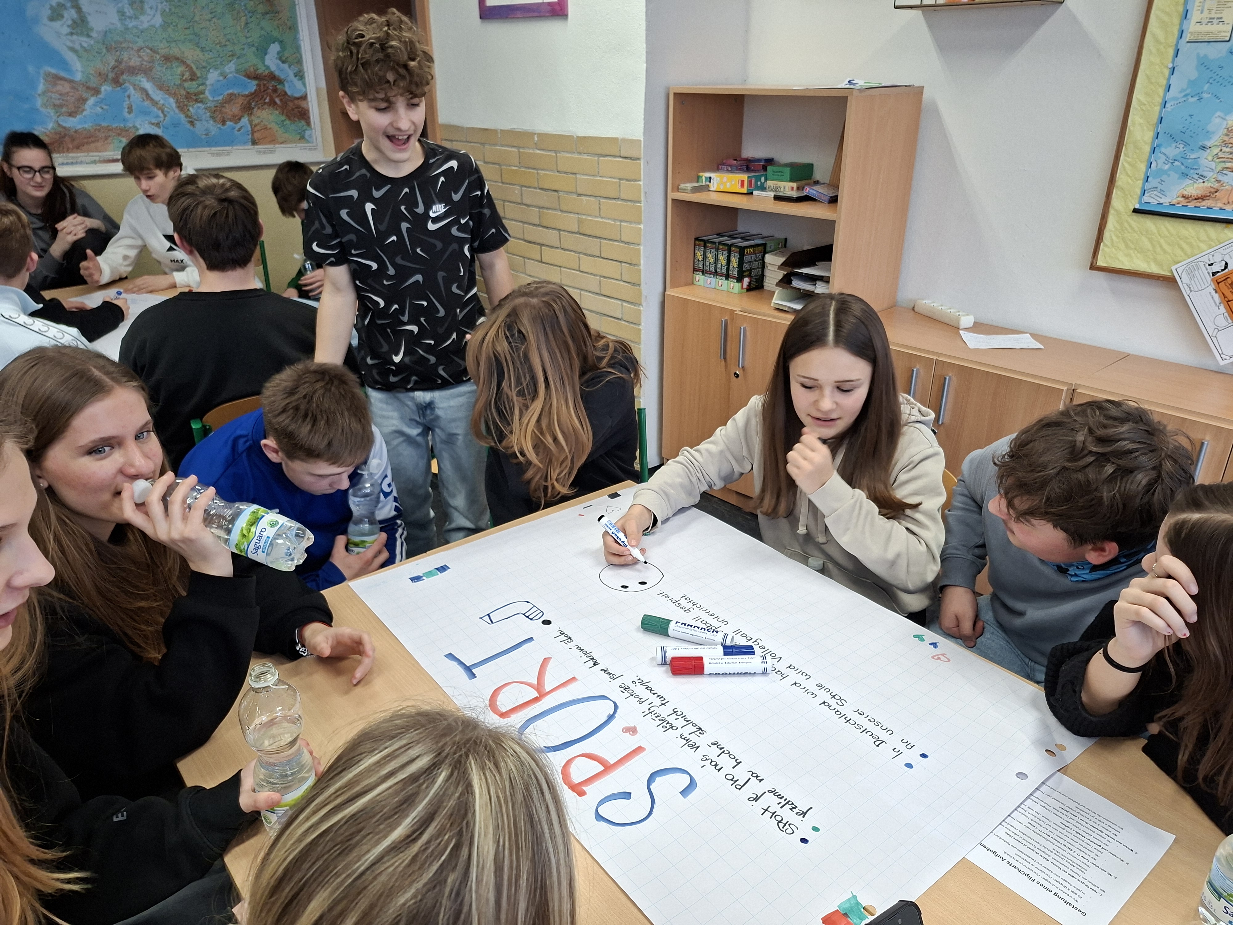 Poté všichni společně pracovali na svém projektu. Plánuje se vydání knihy, která bude dokumentovat tři roky projektu a osvětlí různá témata – mimo jiné „Oblíbené jídlo?“ a „Jaká hudba je právě v módě?“ Poslední stránky budou vytvořeny samotnými žáky. Společně jsme se již podívali na aktuální stav knihy.