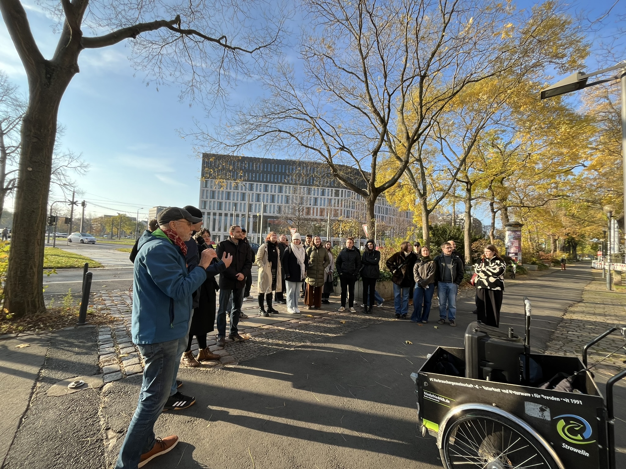 Druhý den začal tematickou prohlídkou města vedenou iniciativou „Mahngang Täter:innen-spuren“ (Pamětní procházka: Stopy pachatelů). Prohlídka se zabývala historickými sférami odpovědnosti a otázkami politiky paměti v Drážďanech. Klíčová místa ve starém městě byla zkoumána z kritického hlediska. Důraz byl kladen na skutečnost, že barokní a turisticky oblíbená náměstí nejsou jen svědectvím o městské architektuře, ale mají také temnou minulost: mnohá z těchto míst byla během nacistické éry místem politických spektaklů, vyloučení a násilí. Tento historický kontext je v současných pohledech na město často přehlížen nebo záměrně ignorován, a proto prohlídka významně přispěla ke kritickému zkoumání kultury paměti ve městě.
