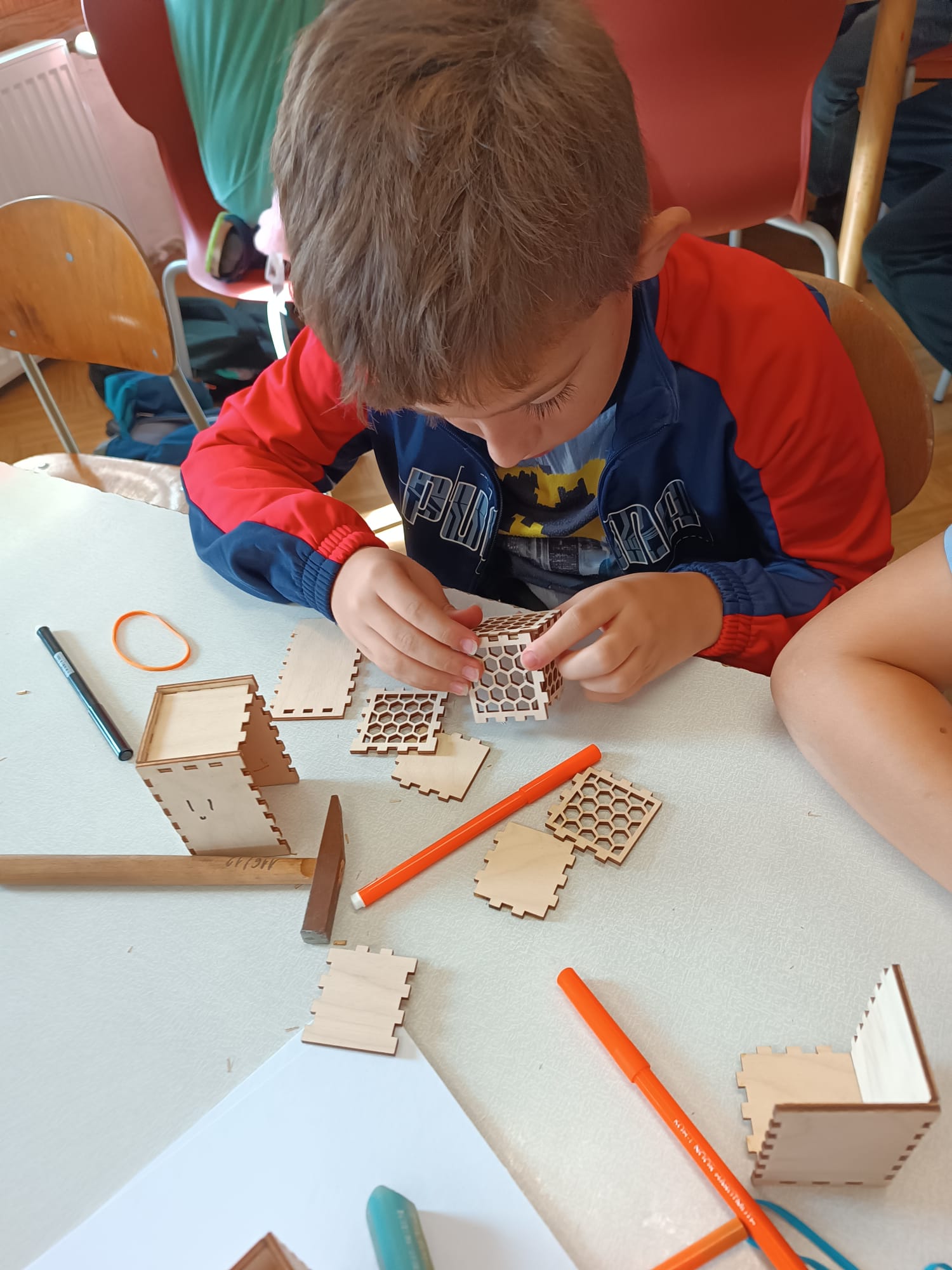 Při návštěvě místního včelaře si žáci poslechli zajímavé vyprávění o životě včel včetně videa, nahlédli do úlů, vyzkoušeli si včelařský oblek, ochutnali med přímo z plástve. Na tvořivých dílnách si z barevných korálků podle nakresleného návodu skládali hady a náramky. Při práci s laserovým strojem si žáci vytvořili grafický návrh výrobku. Poté jim lektor ukázal postup od jejich návrhu přes úpravy až po samotnou výrobu na stroji.
