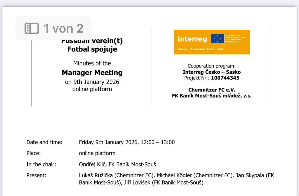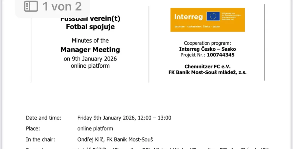 Na schůzce manažerů 9. ledna 2026 byl finalizován tréninkový plán na zimní měsíce. V lednu začnou společné tréninky pro chlapecké a dívčí kategorie, např. testové zápasy U14 Most vs. CFC a GT trénink U15 v Chemnitz. Vrcholem je událost fitness diagnostiky 26. ledna v Mostě: Kondiční srovnání s testy rychlosti, explozivní síly a technických dovedností pod zátěží – s využitím světelných závor a GPS zařízení. Výměna programů mezi CFC (Johann Vavrek) a Baníkem Most.