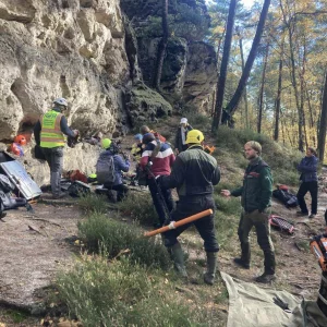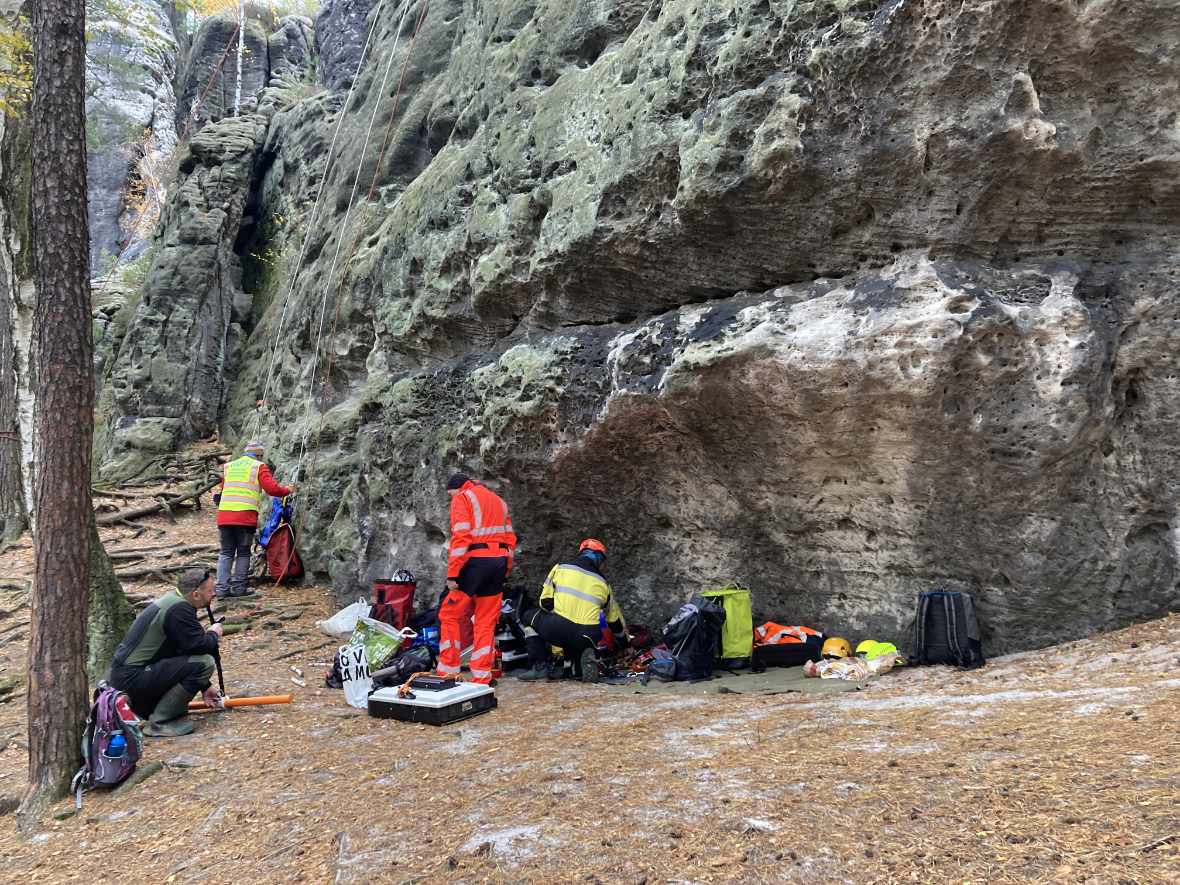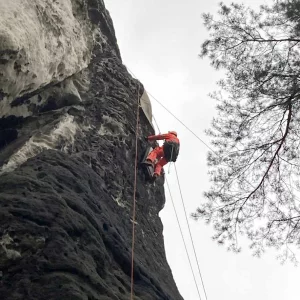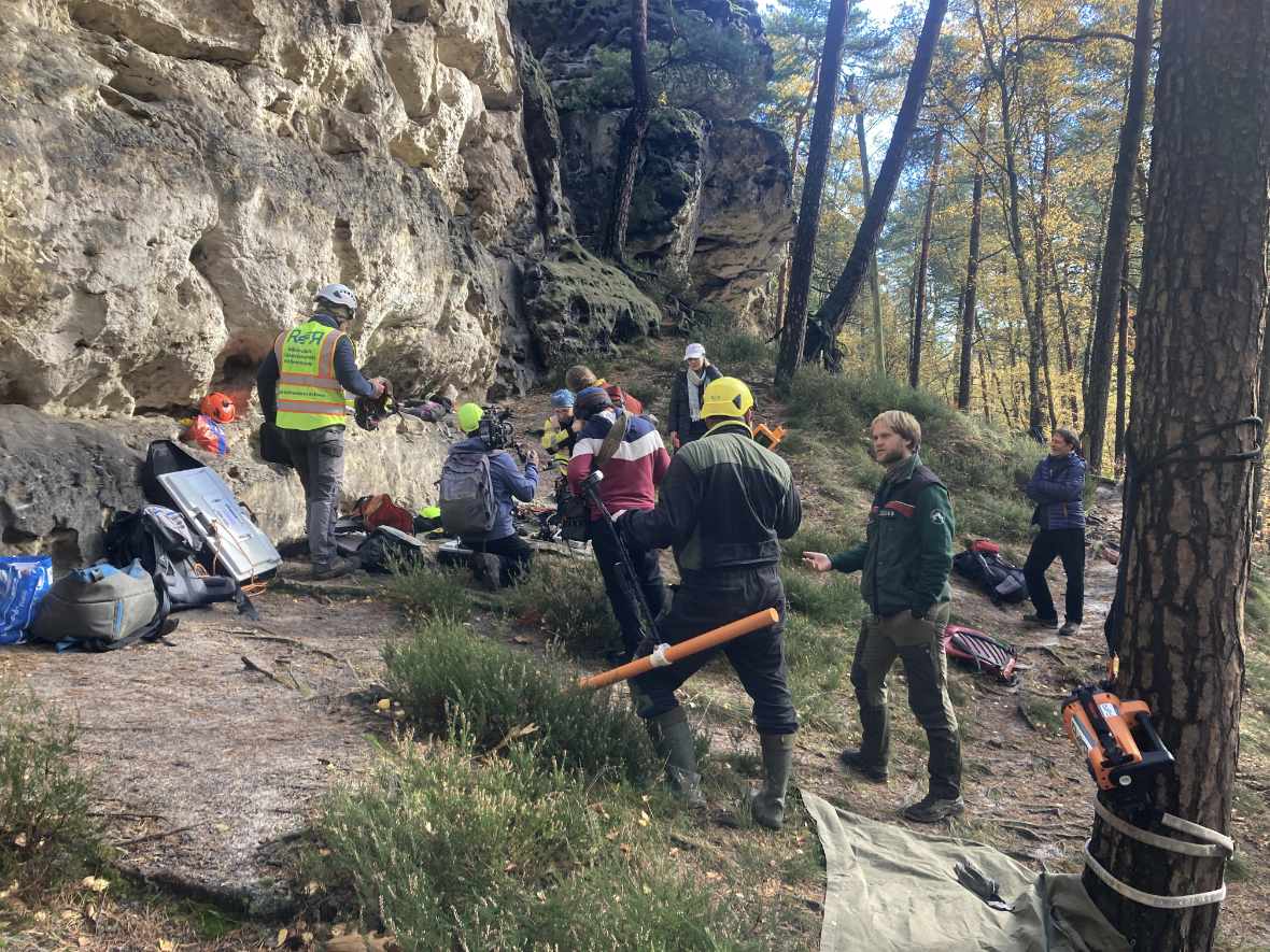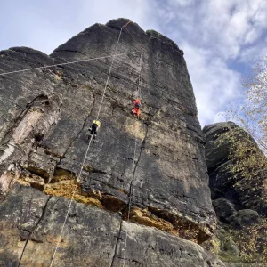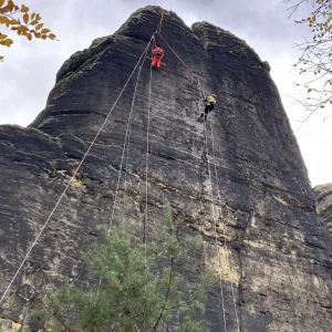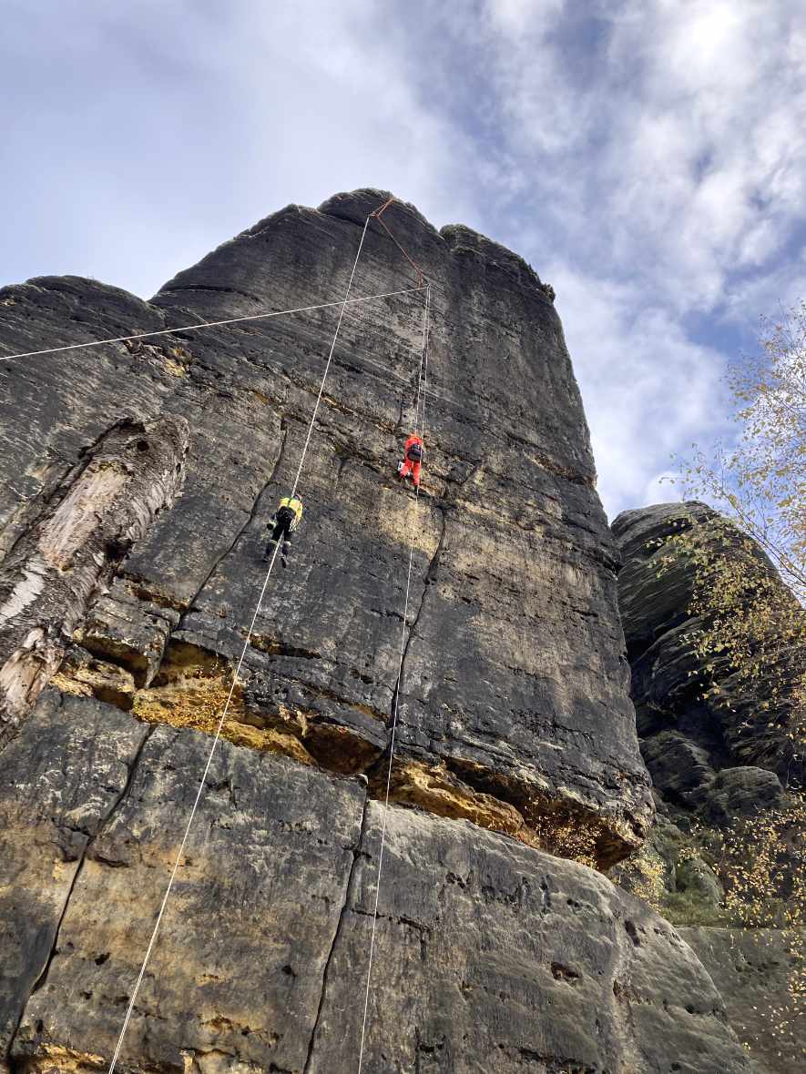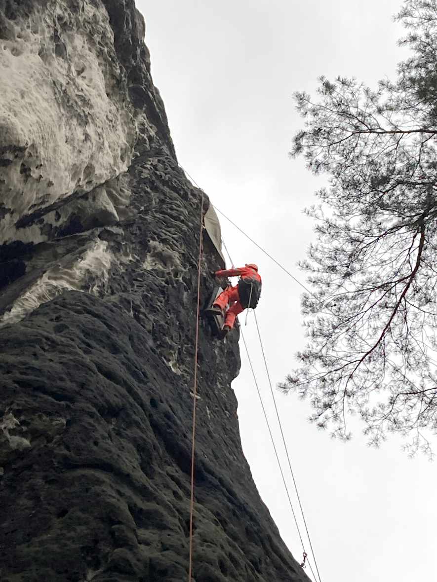 In der letzten Oktoberwoche haben die TU Bergakademie Freiberg und Karlsuniversität Prag geophysikalischen Messungen am Meurerturm, Rauschenstein, Walterdorfer Horn und Östlichen Feldkopf durchgeführt. Die Messungen umfassten Geoelektrik und Georadar in unterschiedlichen Auflösungen. Dabei wurden vertikale Messprofile über den ganzen Felsen erstellt. Die Messungen selber wurden vom Industriekletterer Ronald Reichelt aus Pirna durchgeführt. Durch den teilweise auftretenden Regen und den hohen Windstärken war es inbesondere am Rauschenstein eine klettertechnische Herausforderung. Am Mittwoch begleitete uns ein Fernsehteam des MDR, um einer breiten Öffentlichkeit einen Einblick in unser Vorhaben zu geben. Die Messergebnisse werden in den kommenden Monaten durch die tschechischen Kollegen ausgewertet, während die TU Bergakademie Freiberg gesteinstechnische Labortest und andere materialkundliche Untersuchungen durchführt. Gleichzeitig erstellt die Karluniversiät Prag geometrische 3d-Modelle der Felsen basiernd auf den Daten der Drohnenflüge. Alle Daten werden genutzt, um die ingenieurgeologisch-numerischen 3d-Modelle zu generieren. Diese Modelle bilden weitestgehend die konkreten geologischen Lagerungsverhältnisse, Geometrien und Gesteinsfestigkeiten der jeweiligen Felsen ab. Weitestgehend bedeutet eine Annäherung an die realen ingenieurgeologischen Verhältnisse, da wir natürlich nicht die ganzen Felsen z.B. durch Bohrungen untersuchen können. Für das Frühjahr planen wir die Untersuchungen an Felsen auf böhmischer Seite durchzuführen.