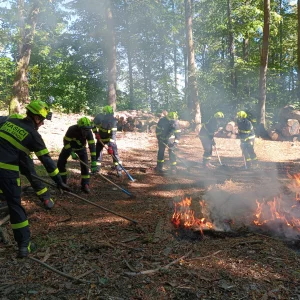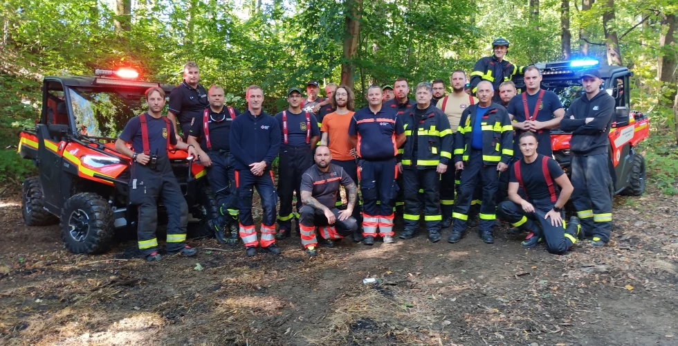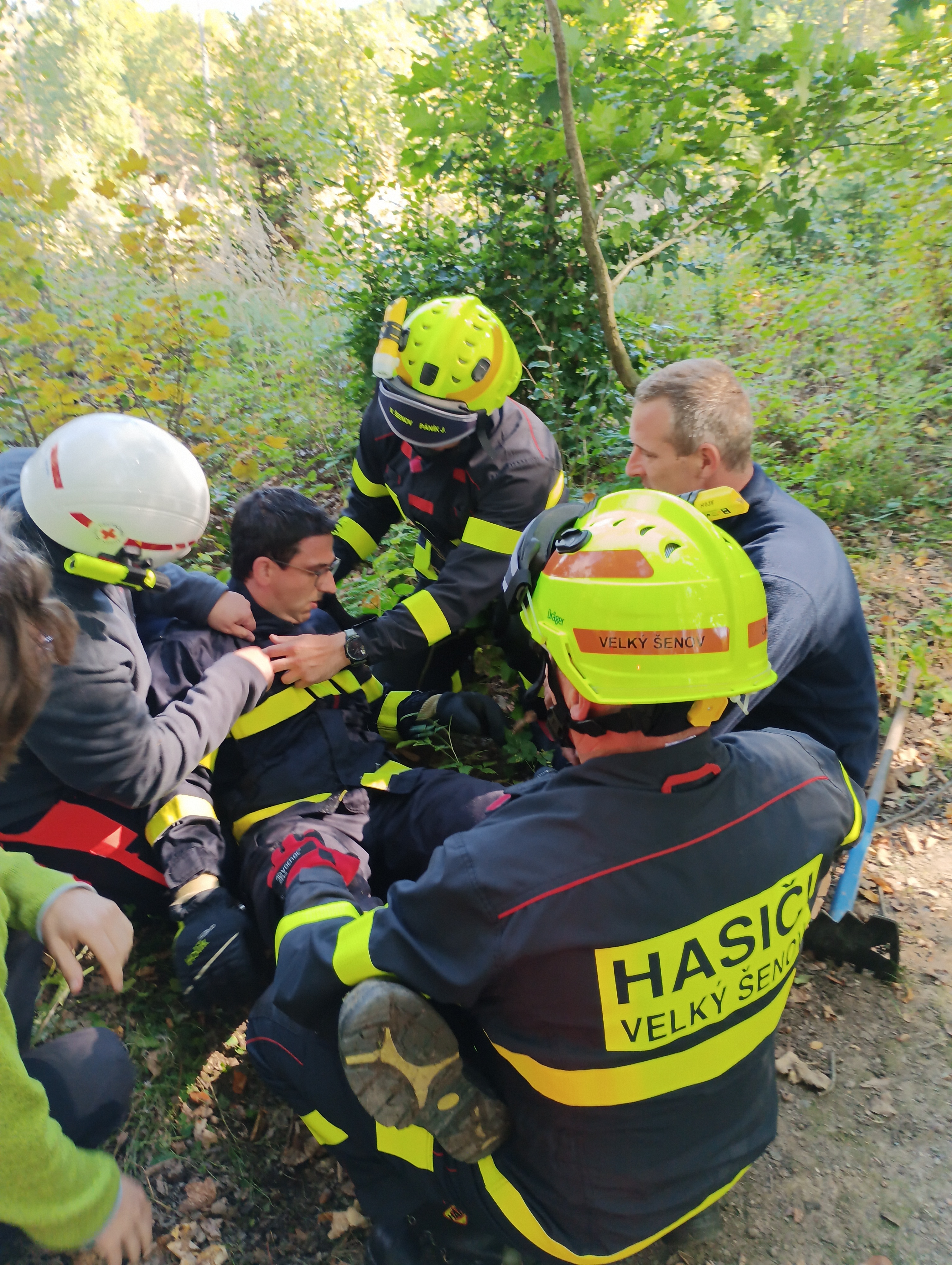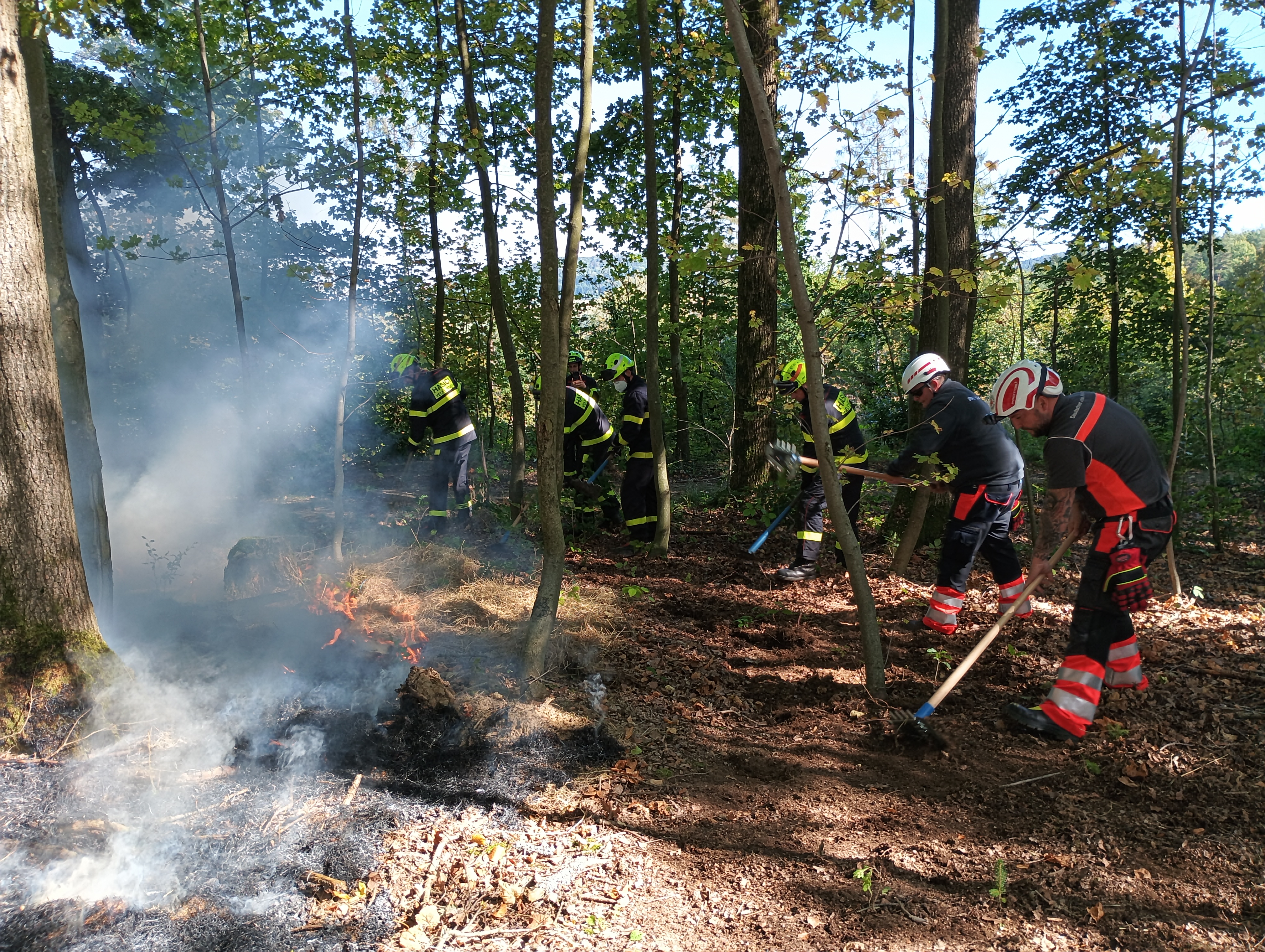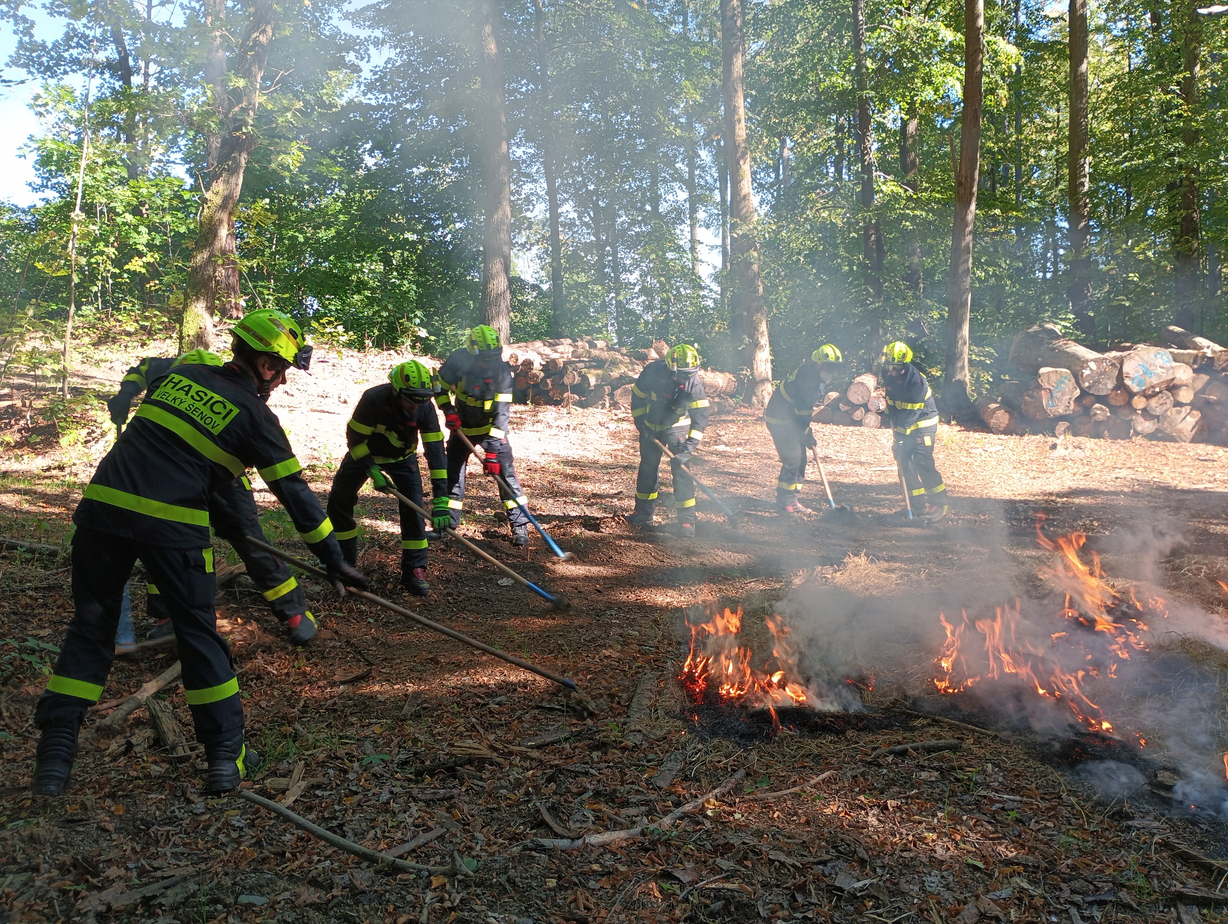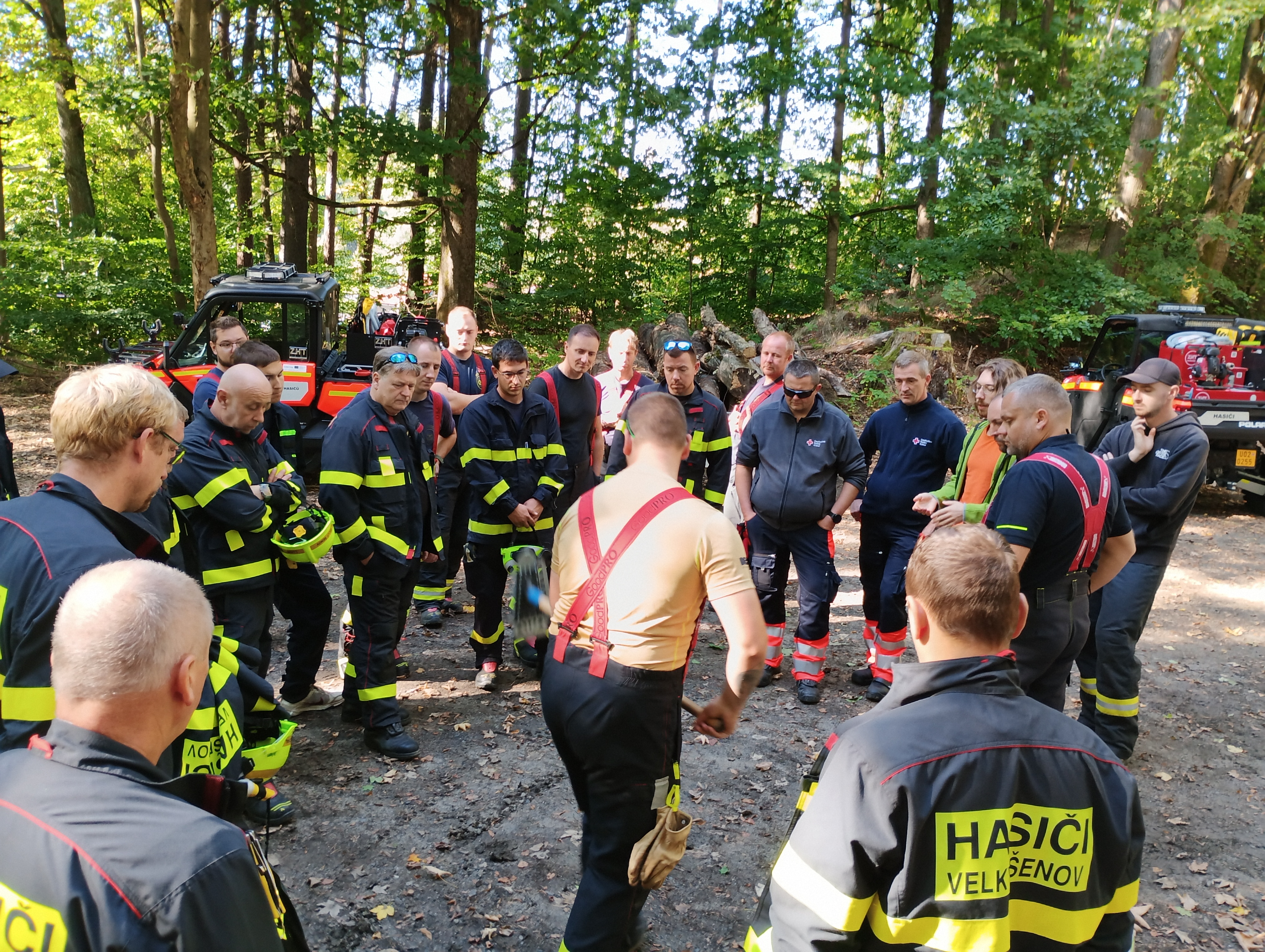 Das Treffen zur gemeinsamen Übung fand in der Feuerwache in Velký Šenov unter Beteiligung von Rettungskräften des DRK Sebnitz statt. Nach der Begrüßung begaben sich alle zum Schwimmbadgelände in Velký Šenov, das sich direkt unterhalb des Waldes befindet. Dort gab es eine kurze Besprechung, in der die Aufgaben und Positionen verteilt und die jeweiligen Einsatzkräfte eingeteilt wurden. Was die Feuerwehrleute und Rettungskräfte zuvor selbst ausprobiert hatten, mussten sie nun gegen das Feuer anwenden. Nachdem das Feuer gelöscht war, folgte der zweite Teil der Übung, ein Einsatz in unwegsamem Gelände. Dabei erlitt ein Feuerwehrmann einen Asthmaanfall, musste behandelt und in einen Krankenwagen gebracht werden. Die Feuerwehrleute erprobten anschließend, was sie im ersten Teil trainiert hatten, als nur eine begrenzte Menge Stroh brannte. Ein Geländewagen traf ein, um das Feuer zu löschen. An der Übung nahmen auch Feuerwehrleute aus Rumburk teil, die ebenfalls über ein neu erworbenes Quad aus einem anderen Förderprogramm verfügen und dieses bereits nutzen und damit Erfahrung gesammelt haben. Genau diese Erfahrung gab der Feuerwehrchef von Rumburk an die Feuerwehrleute aus Velký Šenov weiter. Auch Feuerwehrleute aus Šluknov und Varnsdorf nahmen an der Übung teil. David Leičko, Vertreter der Feuerwehr Varnsdorf und Teilnehmer an Auslandseinsätzen, hielt einen Vortrag mit praktischer Demonstration zu Methoden der Waldbrandbekämpfung. Diese Methoden wurden anschließend von Feuerwehrleuten und Rettungskräften erprobt. Ein Feuerwehrmann erlitt eine Rauchvergiftung, wurde behandelt und in einen Krankenwagen gebracht. Das war auch Teil der Übung, eine Überraschung des Einsatzleiters, alle dachten, es sei echt.