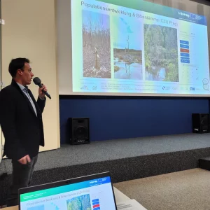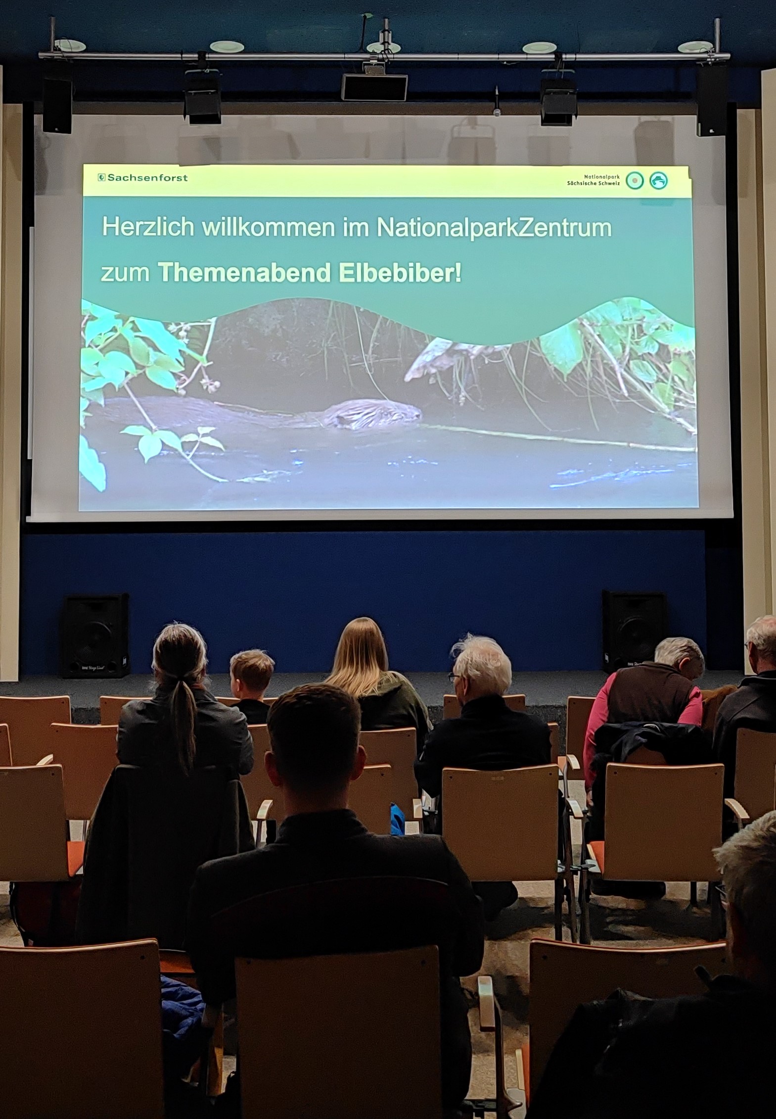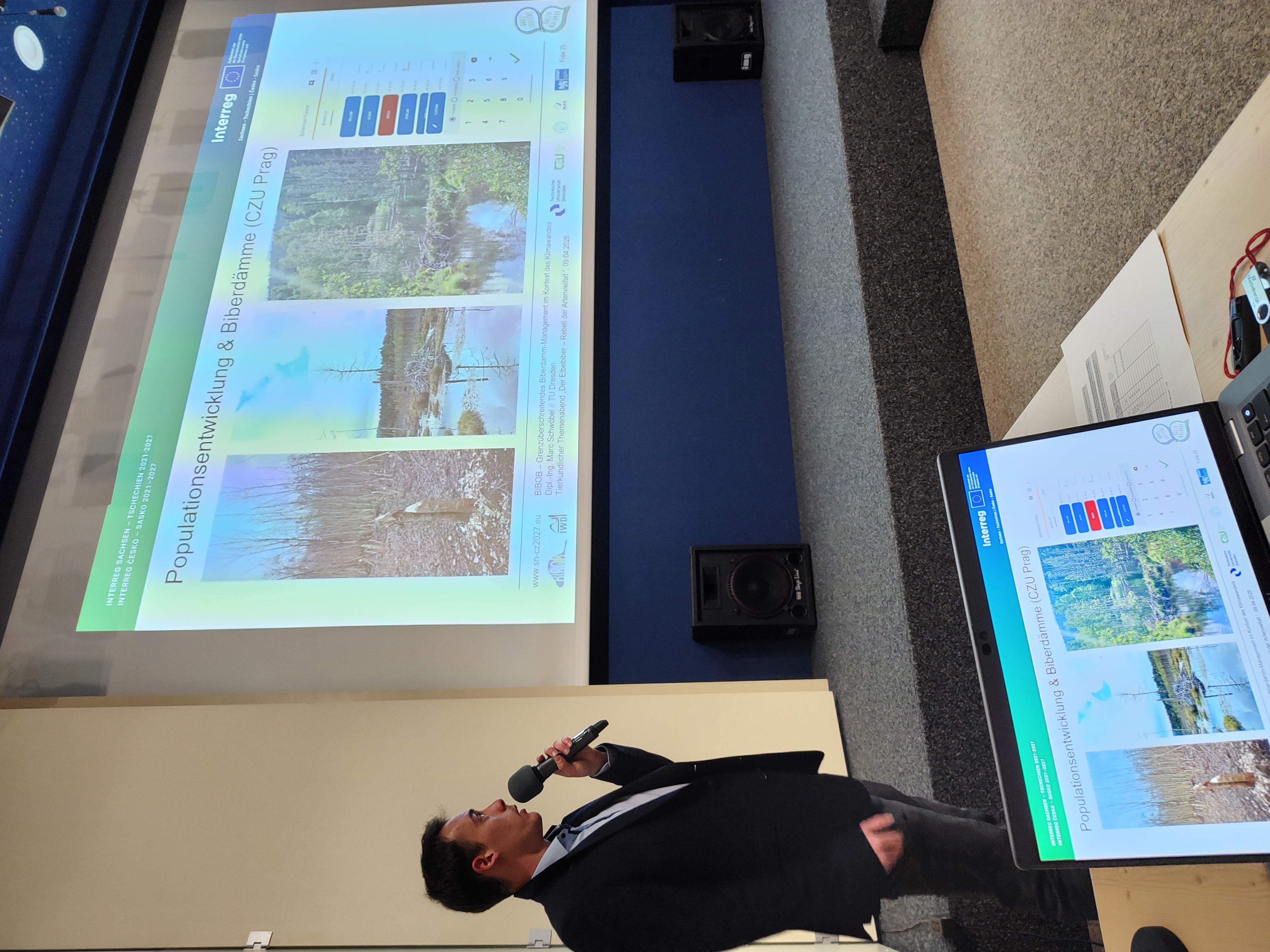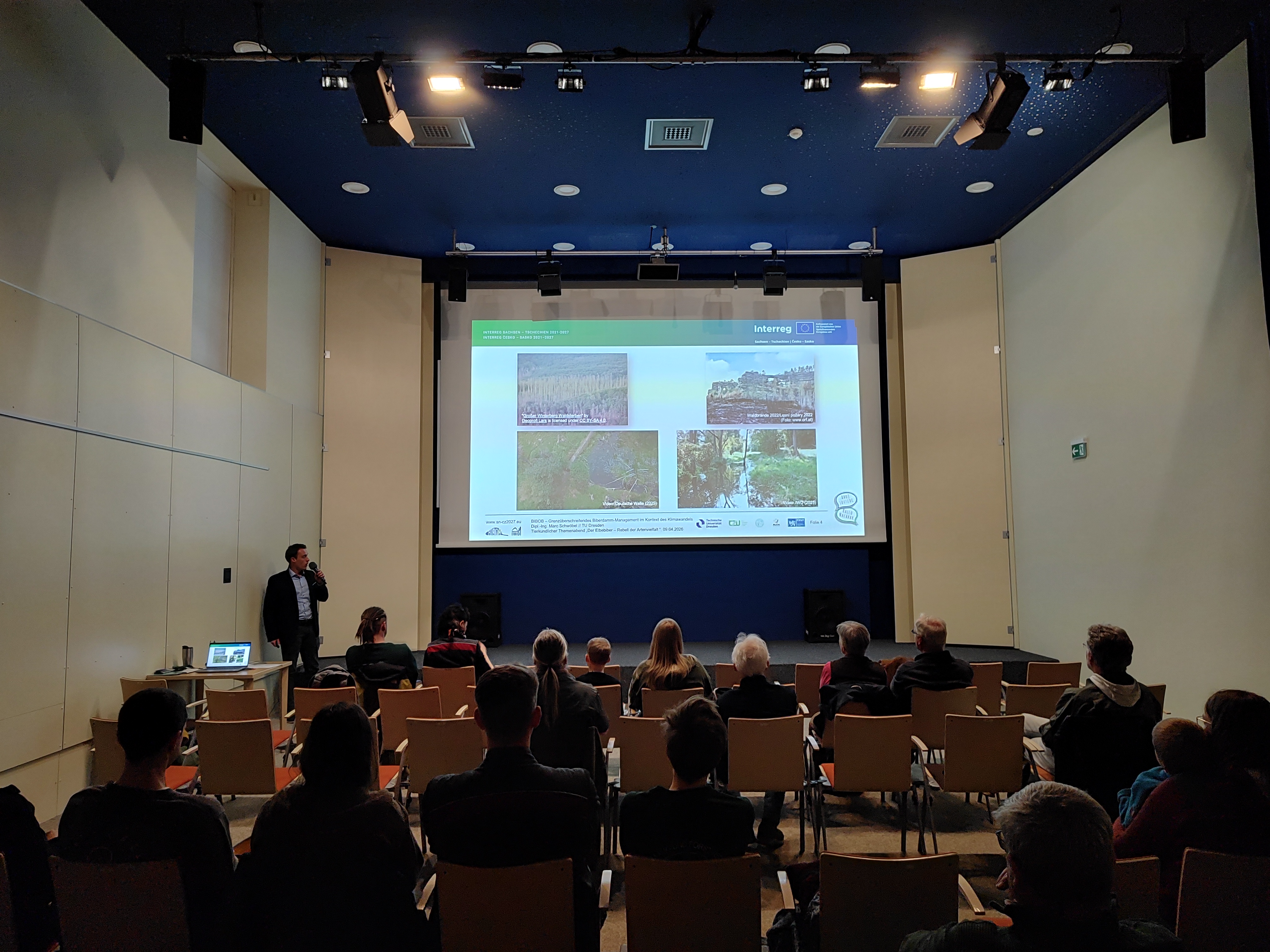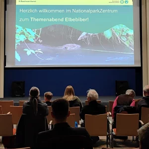 Anlässlich des Internationalen Tages des Bibers am 9. April 2026 und der Sonderausstellung „Der Elbebiber – Rebell der Artenvielfalt“ lud Sachsenforst zu einem tierkundlichen Themenabend in das NationalparkZentrum Sächsische Schweiz ein. Marc Schwöbel vom BIBOB-Projektteam präsentierte den interessierten Gästen aktuelle Forschungsergebnisse, gefolgt von einer regen Diskussionsrunde. Im Fokus standen dabei hydraulisch-hydrologische Feldmessungen in Sachsen und Tschechien sowie das Biberdamm-Monitoring an Sebnitz und Bahre. Zudem wurden Ergebnisse numerischer Simulationen für ein Biberfeuchtgebiet am Liščí potok sowie Daten aus dem Bibermonitoring in der Region Šluknov vorgestellt. Der Abend wurde mit einer weiteren Präsentation von Jan-Christian Gibson abgerundet, der praxisnah über das Bibervorkommen und die Biberaktivitäten in der Nationalparkregion – speziell an Kirnitzsch, Polenz und Sebnitz – informierte. Ziel der Veranstaltung war es, die Schlüsselrolle des Bibers bei der Minderung klimabedingter Risiken hervorzuheben.
