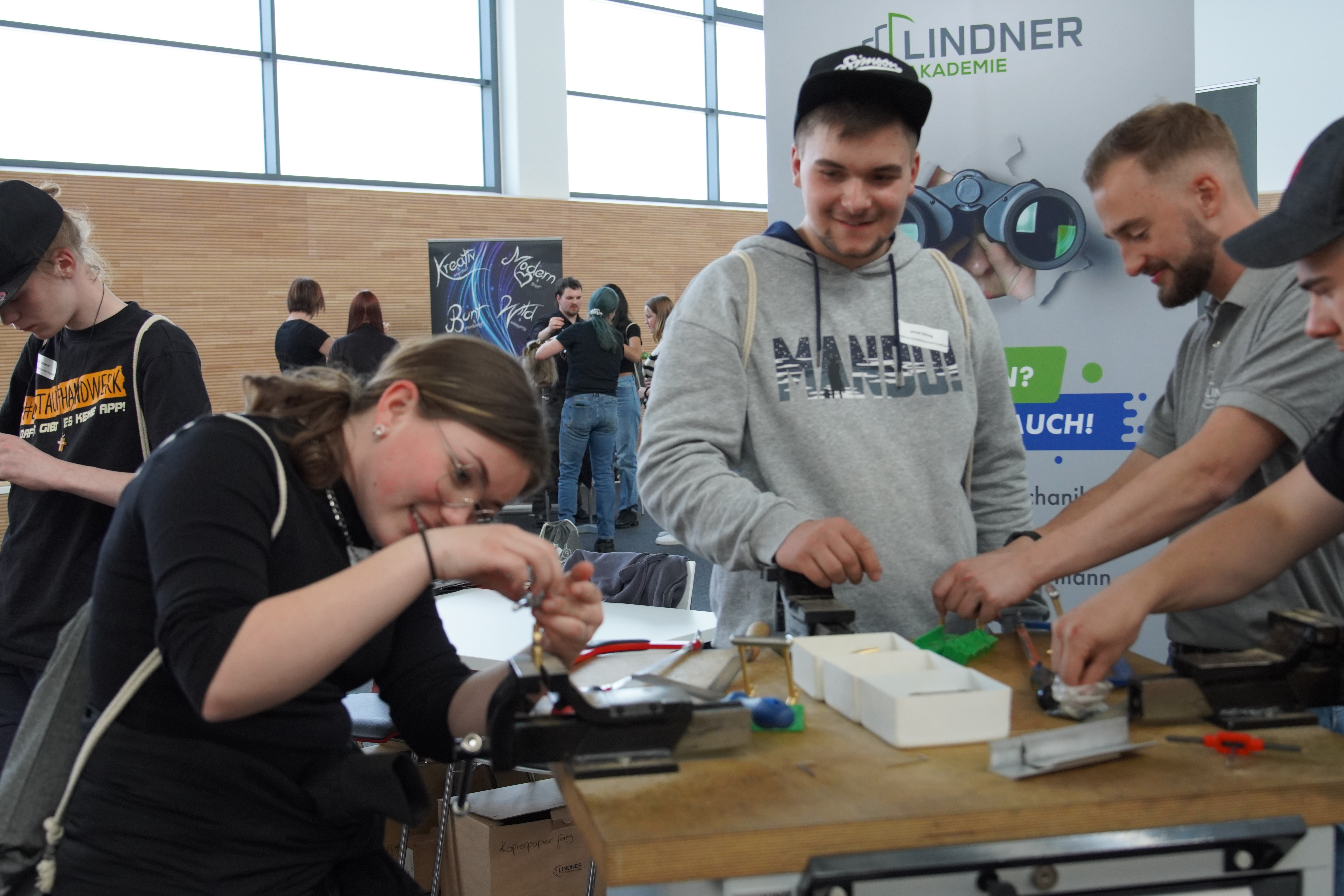 Bei dieser besonderen Veranstaltung haben Vertreter von Unternehmen, Ausbilder und Auszubildende die Möglichkeit, an ihren jeweiligen Stationen kleine Gruppen von Jugendlichen für ihre Berufe zu begeistern und ihnen realistische Einblicke in die Tätigkeiten zu vermitteln. Sie geben Jugendlichen die Möglichkeit, sich praktisch auszuprobieren. Und die dabei zu lösenden Aufgaben könnten unterschiedlicher kaum sein: vom Löten einer elektrischen Schaltung über das Flechten von Hefezöpfen bis hin zur präzisen Vermessung eines Drehteils. Die Schüler dadurch können für Berufsfelder gewonnen werden, die ihnen bisher vielleicht noch nicht bekannt waren.