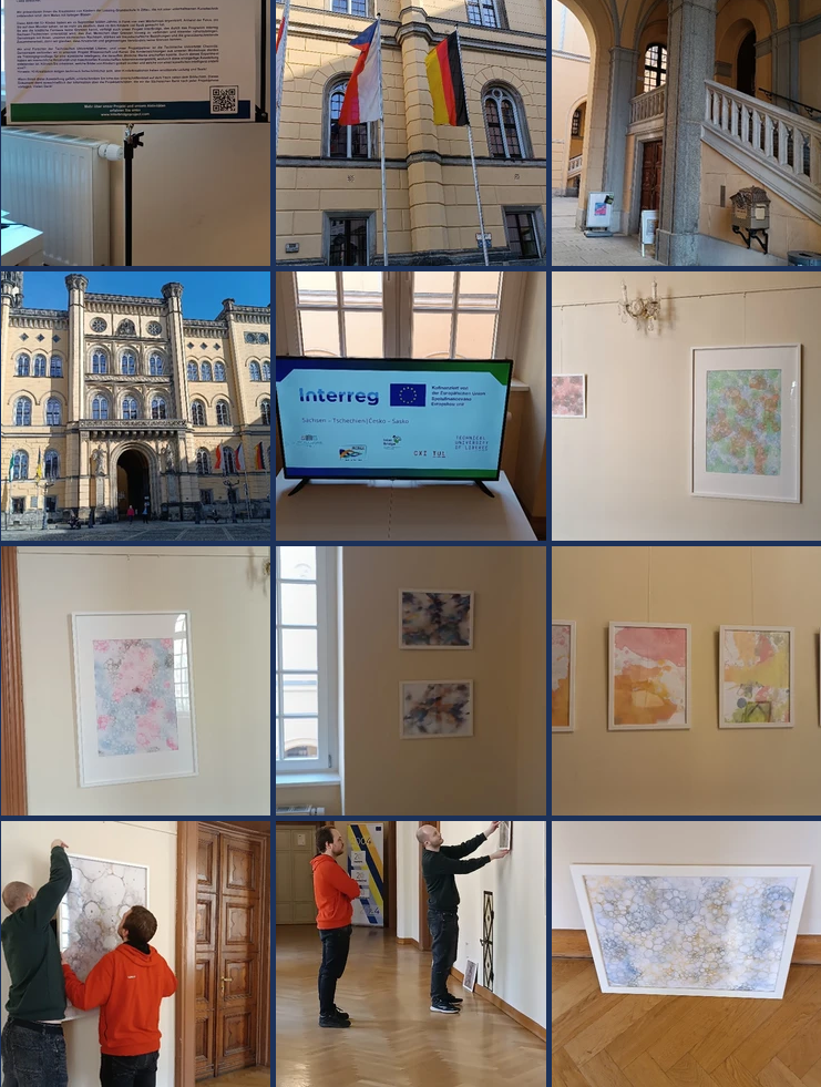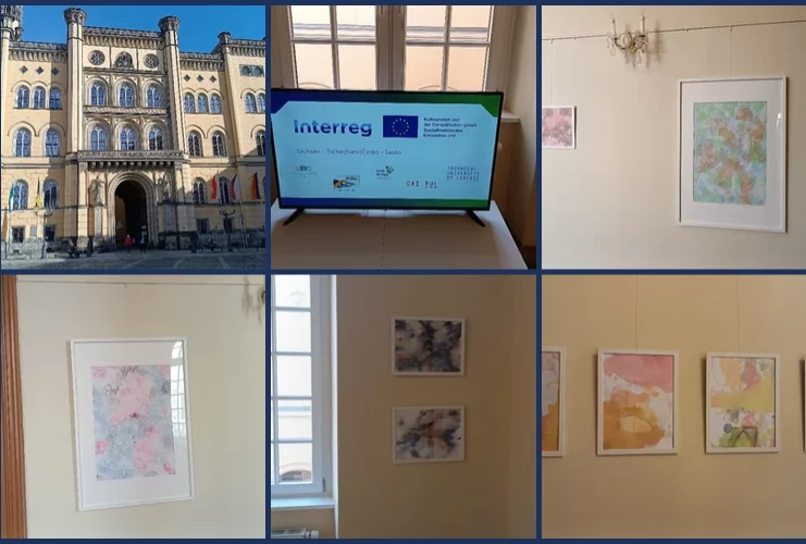 Die Ausstellung in Zittau ist der Abschluss unserer ersten Wanderausstellung. Wir präsentieren hier Arbeiten, die während zweier Workshops „Malen mit Blasen” entstanden sind, die wir im vergangenen Jahr für Kinder der Lessing-Grundschule in Zittau organisiert haben. Faszinierend ist der Vergleich dieser Kinderwerke mit Bildern, die von einer künstlichen Intelligenz geschaffen wurden, die anhand ihrer Zeichnungen trainiert wurde. Die Ausstellung umfasst auch eine multimediale Präsentation, die die beteiligten Institutionen – TUL, TUC, Lessing-Grundschule, die Städte Liberec und Chemnitz sowie das Programm Interreg Tschechien-Sachsen – vorstellt. Auf dem Bildschirm sehen Sie Fotos aus den Workshops, auf denen die Kinder vor Freude und Energie sprühen. Außerdem gibt es hier unseren Rollup-Banner, der Informationen über das Projekt InterBridge liefert.
