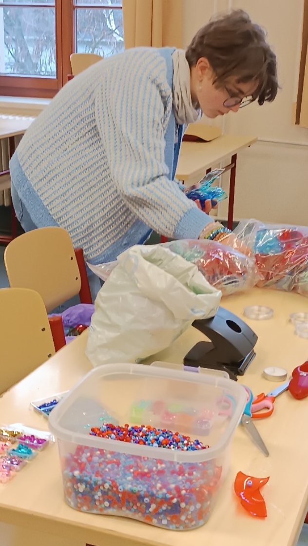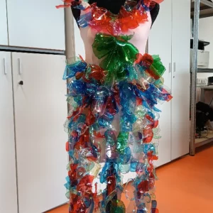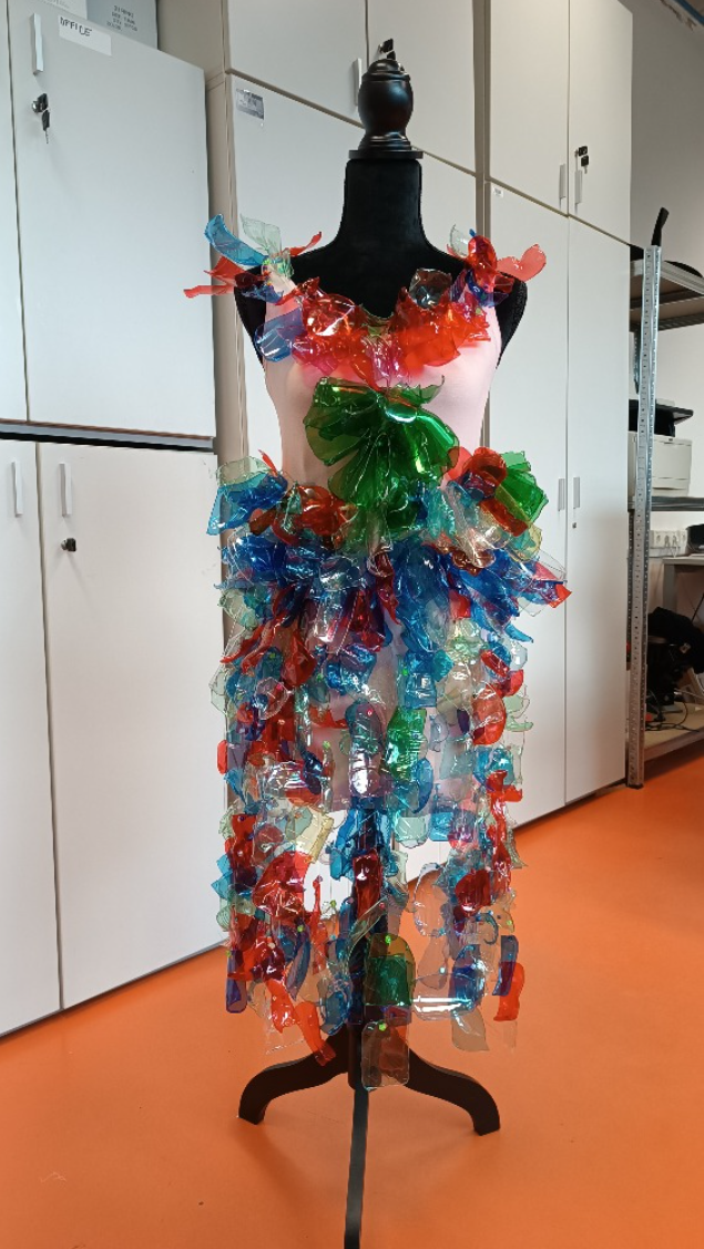 Die Grundidee war einfach: Zerschnittene PET-Flaschen als Material für die Gestaltung eines Kleides auf einer Schneiderpuppe zu verwenden. Im Laufe des Vormittags fädelten die Schüler:innen bunte Stücke von PET-Flaschen auf Monofilamentfäden, durchsetzt mit Perlen von Preciosa Ornela aus Desná. Diese Ketten wurden anschließend auf ein Stoffunterkleid aufgenäht, das die Grundlage des Kleides bildete.