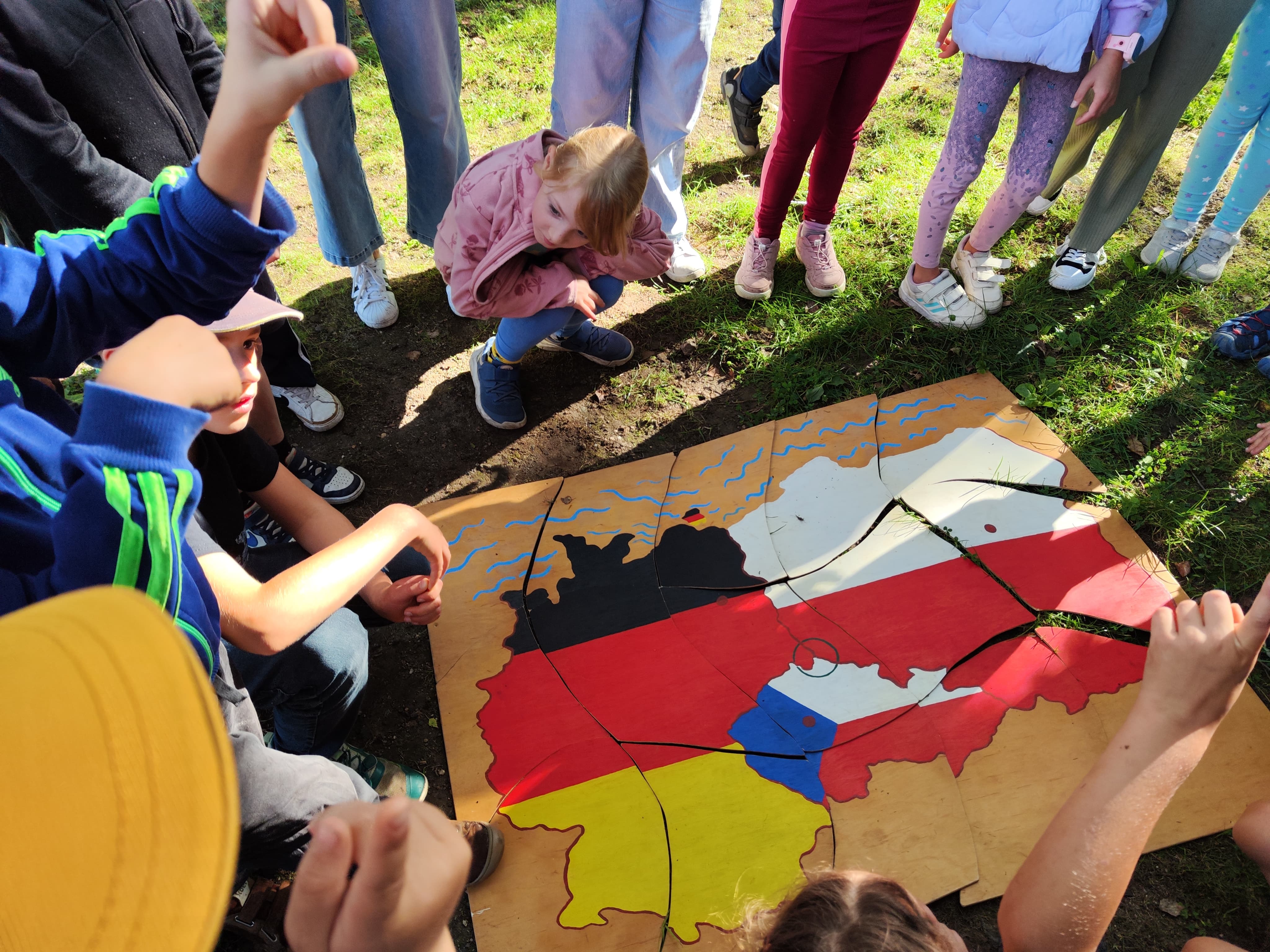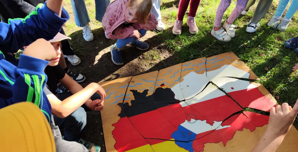 Die Schüler der 2. und 3. Klasse trafen sich außerdem mit Partnerklassen am Kristýna See. Dort lernten sie sich vor allem durch Sprachaktivitäten und Sportspiele kennen. Anschließend legten sie ein Puzzle zusammen (Karte vom Dreiländereck).