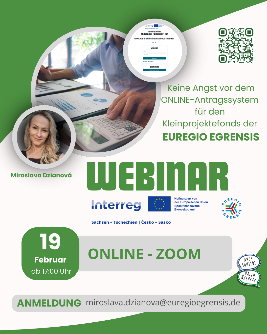 Die Antragstellung in der aktuellen Förderperiode des Kleinprojektefonds der EUREGIO EGRENSIS im Rahmen des Interreg Tschechien–Sachsen Programms ist deutlich vereinfacht wurden. Der gesamte Antragsprozess läuft übersichtlich online ab und aufwändige Nachweise sowie umfangreiche Dokumentationen entfallen. Gerade diese Veränderungen können bei einigen Antragstellerinnen und Antragstellern Unsicherheiten oder Bedenken hervorrufen – das ist vollkommen verständlich. Aus diesem Grund haben wir für Sie ein Online-Webinar vorbereitet, in dem wir Sie, verständlich und Schritt für Schritt, durch den gesamten Prozess der Antragstellung führen. Gemeinsam besprechen wir die Arbeit im Online-Portal, den inhaltlichen Teil der Projekte sowie weitere wichtige Aspekte. Selbstverständlich bleibt auch ausreichend Zeit für Ihre Fragen. 📅 Wann: 19.02.2026 ab 17:00 Uhr 💻 Wo: online (Plattform ZOOM) Bei Interesse melden Sie sich bitte per E-Mail an unter: 📧 miroslava.dzianova@euregioegrensis.de Mit Bestätigung Ihrer Anmeldung erhalten Sie den Zugangslink zum Zoom-Meeting. 👉 Sie müssen sich wirklich keine Sorgen machen – das Webinar richtet sich auch an Einsteigerinnen und Einsteiger bei der Fördermittelbeantragung. Unser Ziel ist es, dass Sie den Prozess sicher und mit gutem Gefühl bewältigen können.